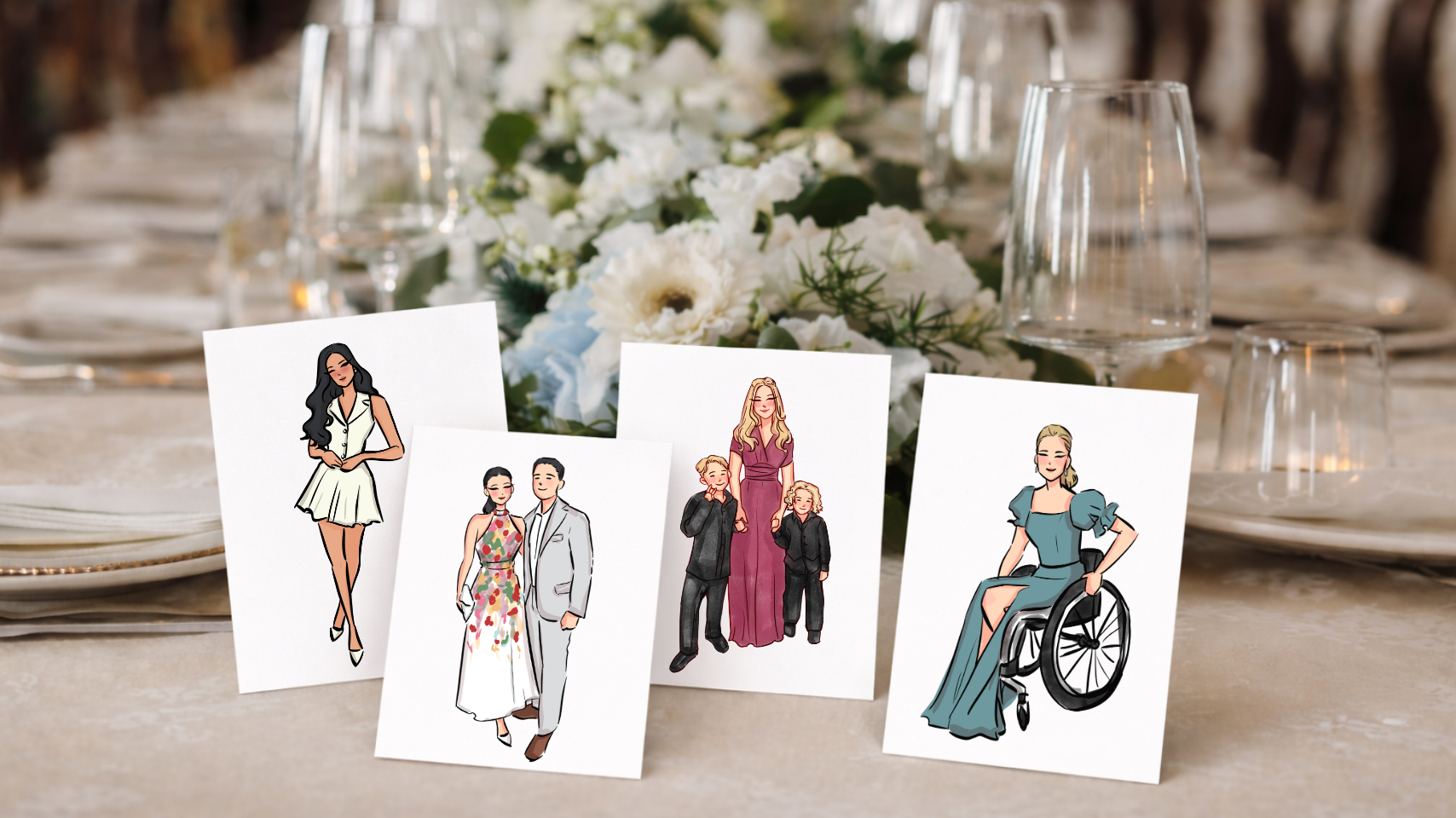 Any guests not illustrated on-site will have their portraits completed in-studio after the event and mailed directly to the couple (1-3 weeks post). If the guest count exceeds the selected package limit, additional portraits are available at $12 per guest.